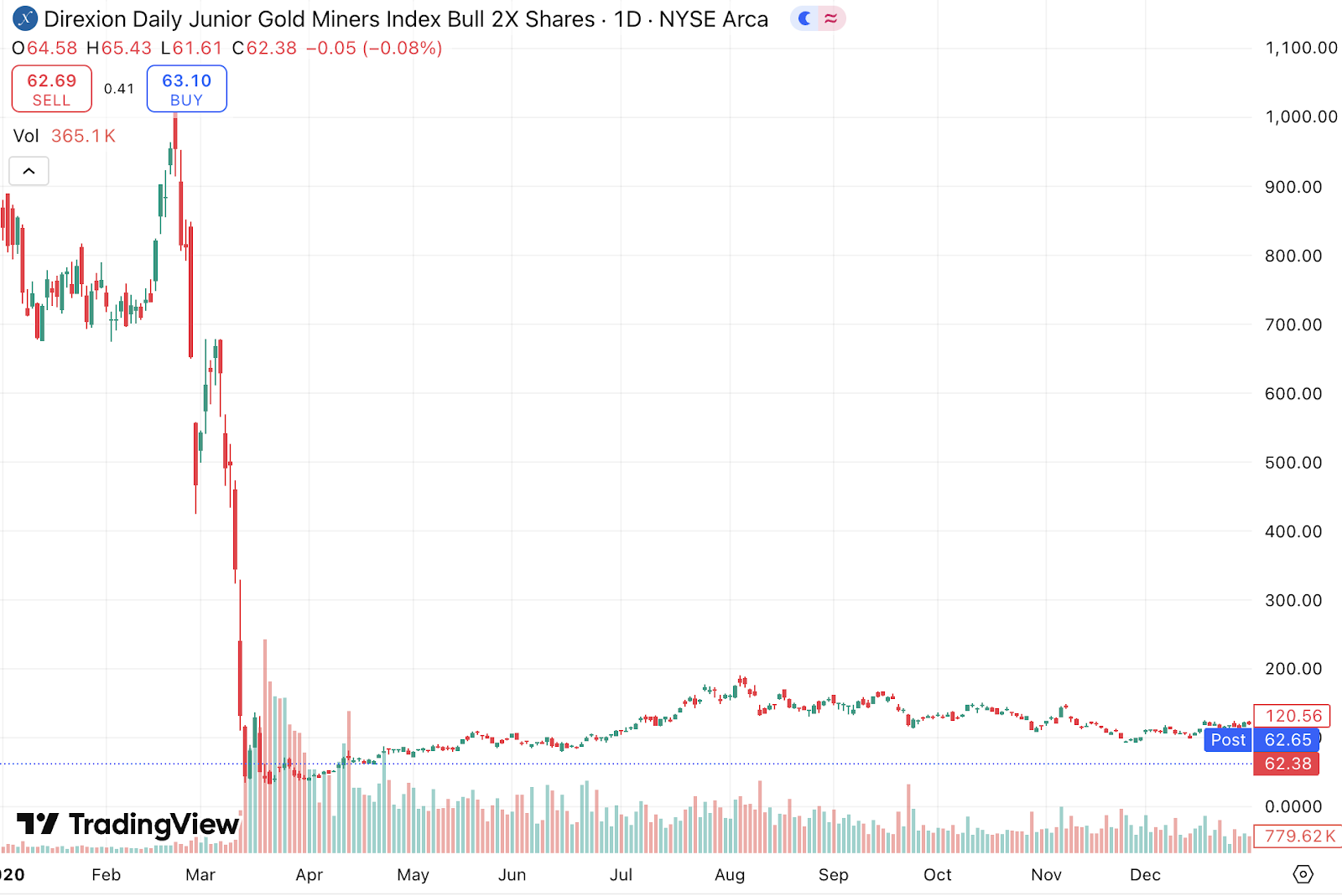 I saw this play out vividly during COVID with the collapse of the 3X* Daily Junior Gold Miners Index ETF (JNUG). In March 2020, as markets plummeted during the COVID panic, investors in JNUG rushed for the exits, demanding cash in size. The ETF’s structure, tied to illiquid junior gold mining stocks, couldn’t keep up. Fund managers were forced to sell assets into a frozen market, where bid-ask spreads widened to chasms. Even though gold prices held strong and later rallied, JNUG’s value cratered.